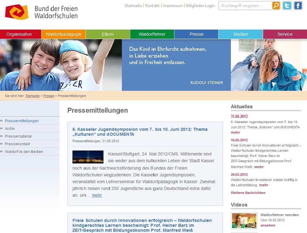 Stuttgart, 6. Juni 2012/CU. Die Homepage des Bundes der Freien Waldorfschulen (BdFWS) waldorfschule.de präsentiert sich nach einem Relaunch jetzt mit einem neuen Erscheinungsbild als umfangreiche Serviceplattform. Im gleichen Layout wie die Homepage wird auch die Facebookseite facebook.com/waldorfschule betrieben.