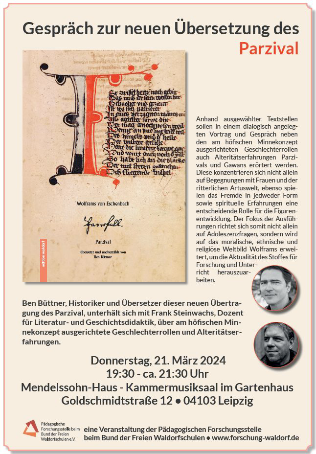 Wolframs Versepos Parzival zählt zu den bedeutendsten Werken mittelhochdeutscher Literatur. Die Pädagogische Forschungsstelle hat dazu jetzt eine leicht gekürzte Neuübertragung in moderne Prosa herausgebracht, die auf der Buchmesse vorgestellt wird. Sie ist besonders für Schülerinnen und Schüler in der Oberstufe der Waldorfschule gedacht. Individuation und Initiation, religiöse und ethnische Toleranz, Spiritualität und Moral können am Beispiel des Parzival thematisiert werden, „zeitlose Themen, die aber angesichts der globalen Entwicklung aktueller denn je sind“, betont die Forschungsstelle dazu. Eine Veranstaltung mit Autor Ben Büttner zum neu übersetzten Parzival findet u. a. im Mendelssohn-Haus in Leipzig statt. Wolfram von Eschenbachs Parzival hat im Curriculum der Oberstufe an den Waldorfschulen seinen festen Platz.