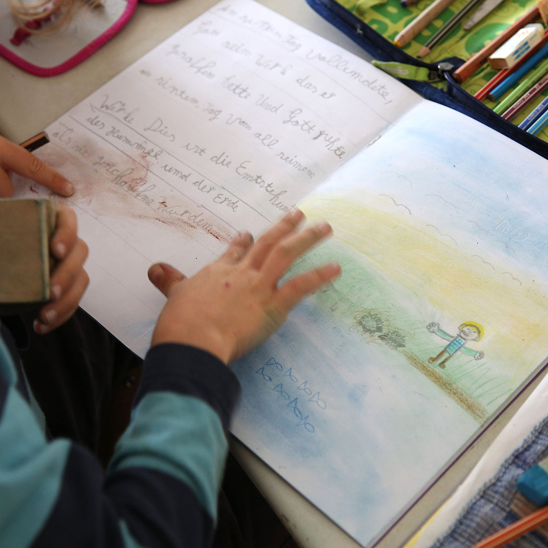 Waldorfpädagogik will die kreativen Kräfte der Schüler:innen von Grund auf entfalten. Anstatt mit vorwiegend vorgegebenen Formen zu arbeiten, die ggf. Lücken zum Ausfüllen bieten, ersetzen selbstgestaltete Epochenhefte weitgehend die Lehrbücher.