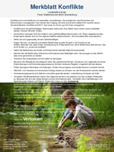 Der Landeselternrat der Freien Waldorfschulen Berlin-Brandenburg hat eine informative und hilfreiche Broschüre erstellt, die Eltern im Konfliktfall an ihrer Schule als Leitfaden dienen kann. Dazu ist noch ein übersichtliches Merkblatt zum allgemeinen Umgang mit Konflikten erarbeitet worden.