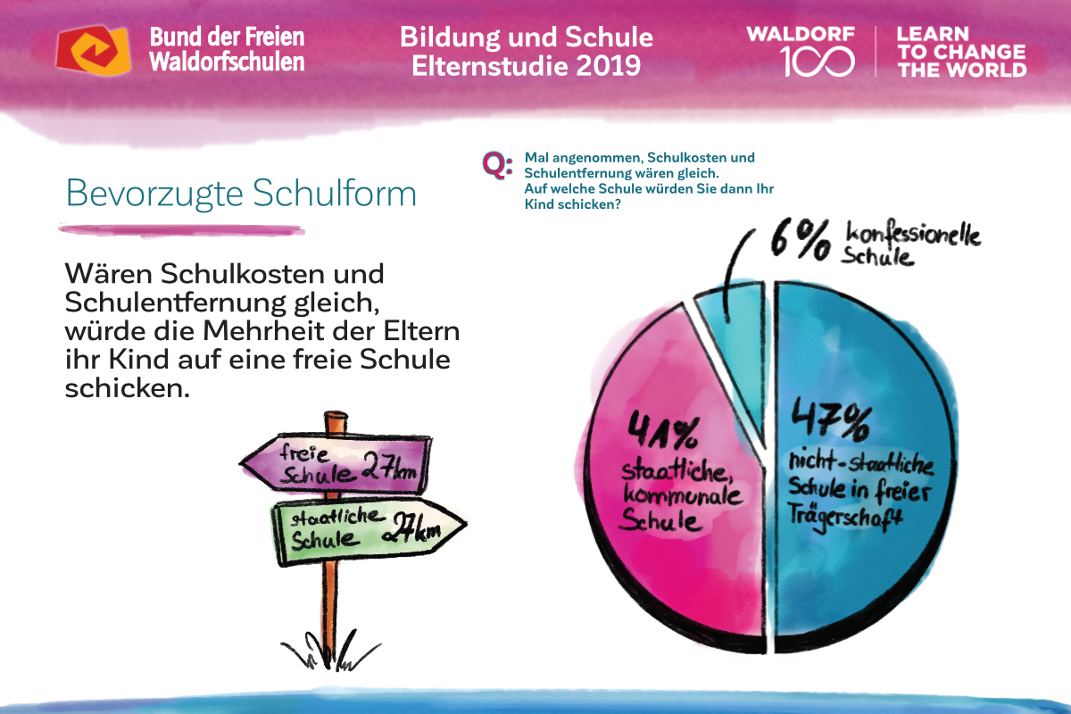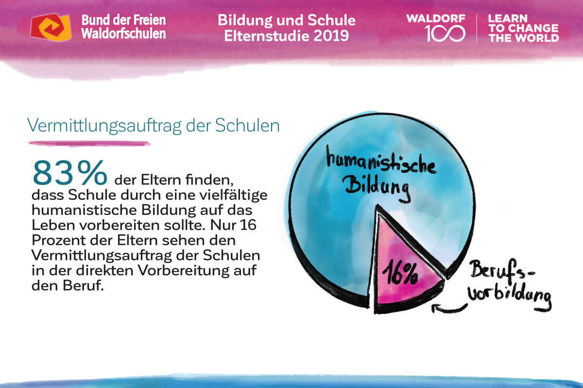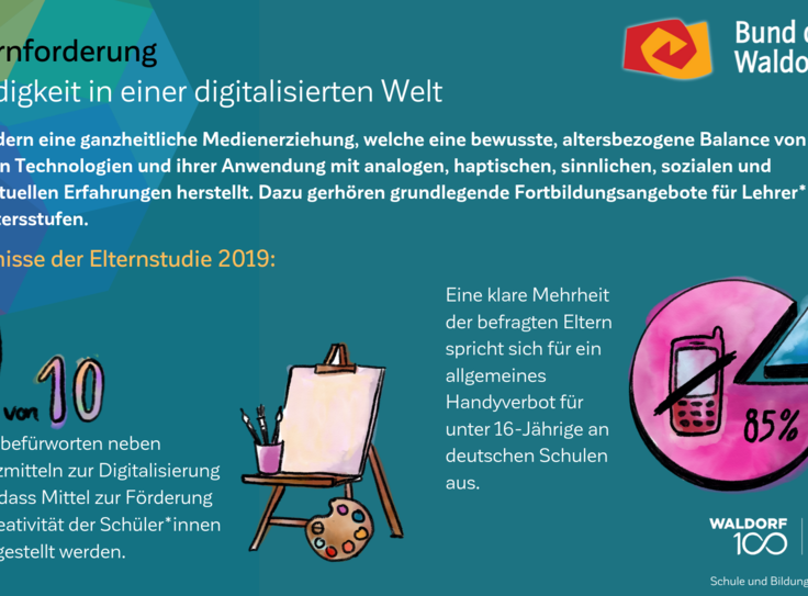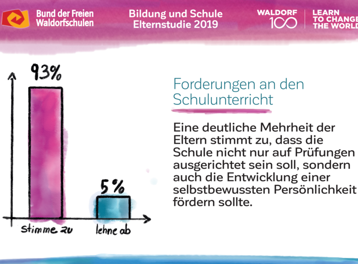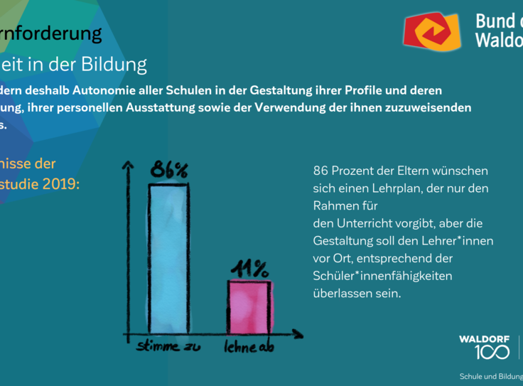 Auch am 100. Geburtstag der Waldorfpädagogik ist unser Blick in die Zukunft gerichtet. Wir setzen uns mit aller Kraft für ein zukunftsfähiges Schulwesen ein, das die Individualität der Schülerinnen und Schüler, die Professionalität der Lehrkräfte und die Mündigkeit der Eltern gleichermaßen ernst nimmt. Um dieses Ziel zu erreichen und die erforderlichen Debatten anzuregen, haben wir unsere Vision in „7 Kernforderungen an die Bildungspolitik“ zusammengefasst. Die Ergebnisse der Elternstudie 2019 zeigen eindrucksvoll, dass viele unserer Forderungen den Wünschen und Forderungen der deutschen Schuleltern an das System Schule mehrheitlich entsprechen.
