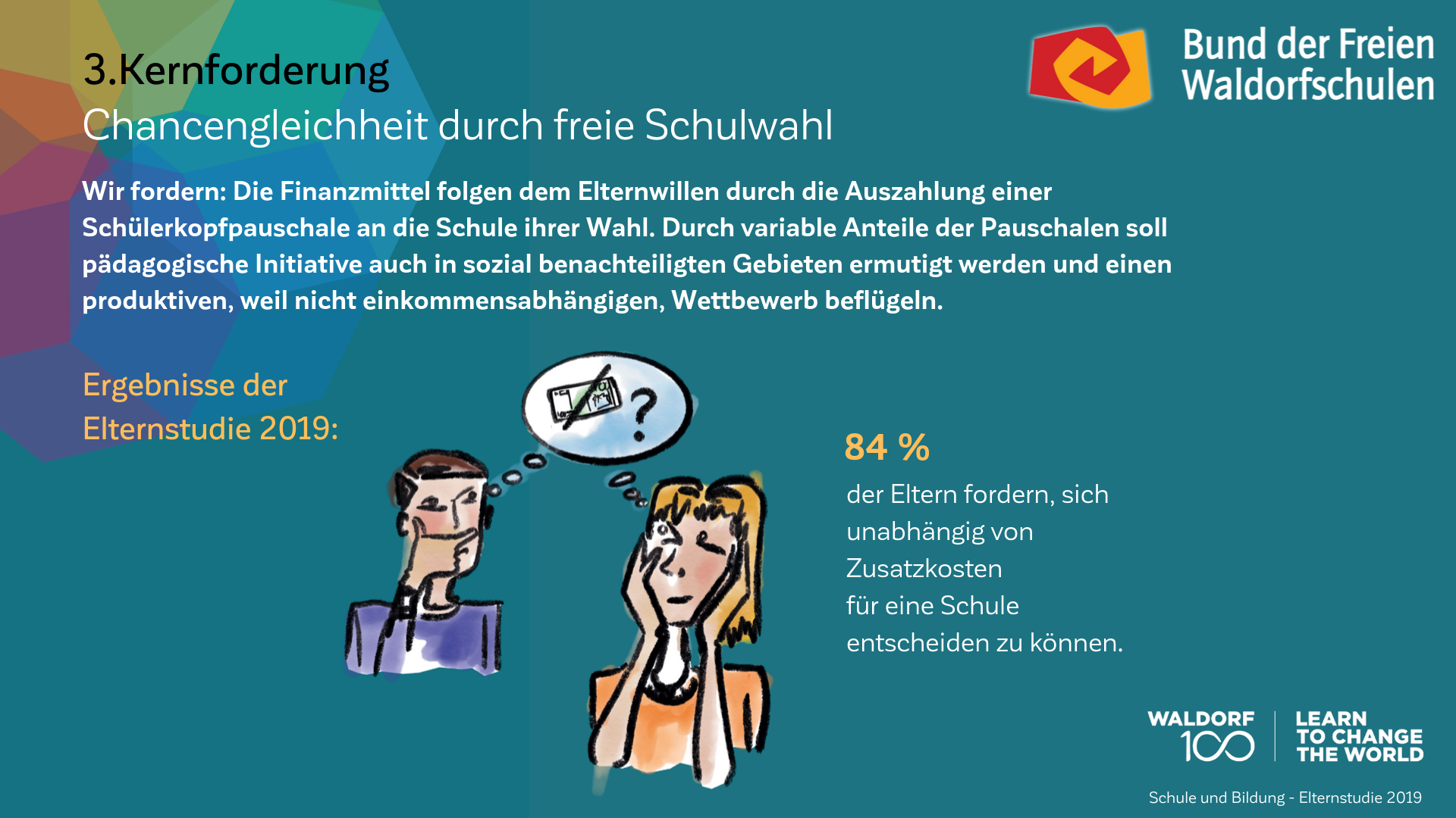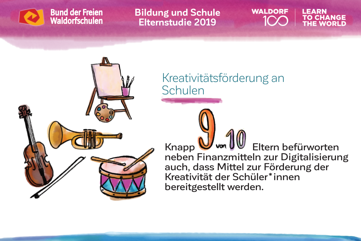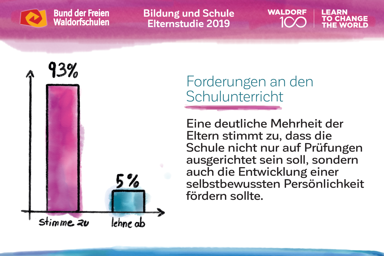 Auch am 100. Geburtstag der Waldorfpädagogik ist unser Blick in die Zukunft gerichtet. Wir setzen uns mit aller Kraft für ein zukunftsfähiges Schulwesen ein, das die Individualität der Schülerinnen und Schüler, die Professionalität der Lehrkräfte und die Mündigkeit der Eltern gleichermaßen ernst nimmt. Um dieses Ziel zu erreichen und die erforderlichen Debatten anzuregen, haben wir unsere Vision in „7 Kernforderungen an die Bildungspolitik“ zusammengefasst. Die Ergebnisse der Elternstudie 2019 zeigen eindrucksvoll, dass viele unserer Forderungen den Wünschen und Forderungen der deutschen Schuleltern an das System Schule mehrheitlich entsprechen.