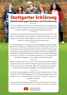 Im Oktober 2007 verabschiedeten die deutschen Waldorfschulen die „Stuttgarter Erklärung“. Im November 2020 wurde die Erklärung in einer überarbeiteten Fassung neu verabschiedet. Sie stellt klar, dass die Waldorfschulen sich von jeder Form der Diskriminierung, also auch von jedweder ethnisch begründeten Form der Diskriminierung, distanzieren. Sie arbeiten auf der Grundlage der anthroposophisch erweiterten Menschenerkenntnis und beziehen aus ihr eine Fülle von Gesichtspunkten, die den Respekt vor der einzigartigen Individualität eines jeden Menschen in den Mittelpunkt ihrer Bemühungen stellen.